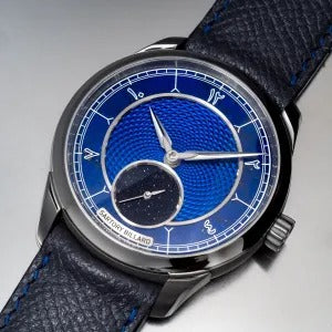 Lapis lazuli minute dial, blued guilloché titanium hour dial and small second in blue aventurine.